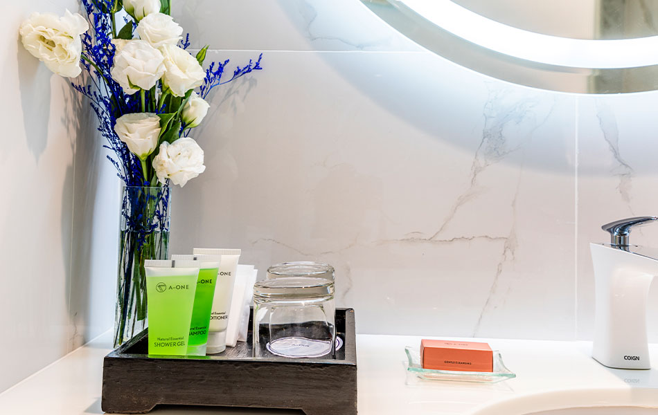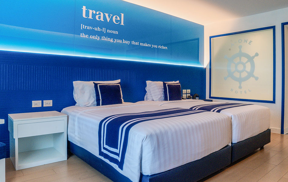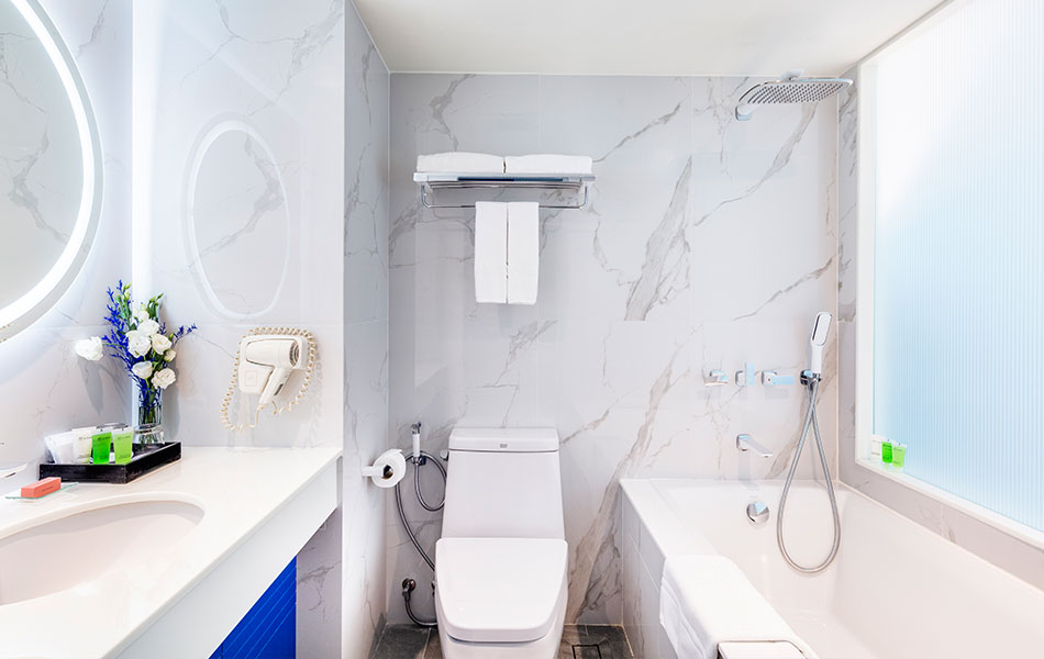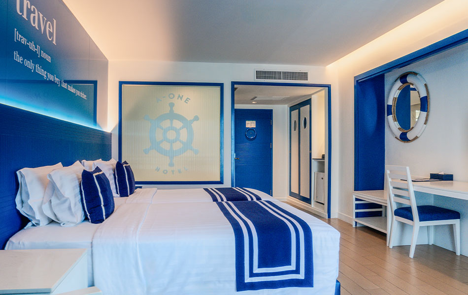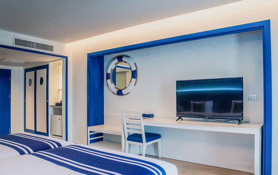 The perfect stay for everyone in the Deluxe Room with bathtub for 2 Single Bed. Designed with a navy theme, overlooking Pattaya city view and unwind out on your private balcony. This cozy space features a total living area of 32 square meters. Enjoy your holiday with Smart TV or party with a JBL Bluetooth speaker.